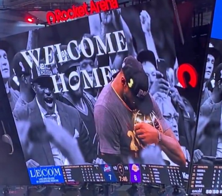 直播吧1月29日讯湖人客场挑战骑士,第一节暂停期间骑士对詹姆斯进行了致敬。