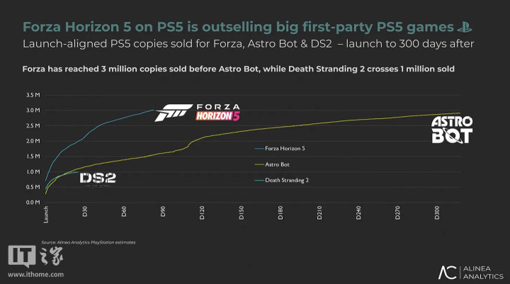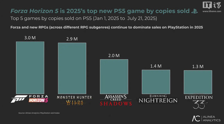 IT之家7月23日消息,数据分析机构AlineaAnalytics发文,透露微软第一方游戏《极限竞速:地平线5》自今年3月正式登陆PS5平台以来,销量已突破300万套,超越了《怪物猎人:荒野》(290万套)、《刺客信条:影》(200万套)、以及《光与影:33号远征队》(130万套)等对手,成为了今年PS5平台最畅销的游戏。