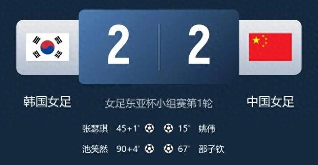 下半场,中国女足主帅米利西奇连续换上王妍雯、唐佳丽等前场球员加强进攻。第67分钟,陈巧珠左路传中,姚伟头球后蹭,邵子钦禁区中路跟进头球接力破门,中国队再次将比分超出。中国女足在场上占据主动,多次威胁韩国队球门。但在全场补时第3分钟,中国队后场解围不够果断,池笑然接到金敏智传球,在大禁区外30米外拔脚怒射,皮球直入球门右上角,韩国队绝平比分,最终双方2-2结束比赛。
