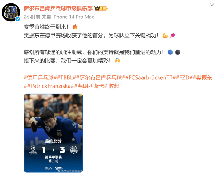 萨尔布吕肯俱乐部官方微博这样写道:“赛季首胜终于到来!樊振东在德甲赛场收获了他的首分,为球队立下关键战功!感谢所有球迷的加油助威,你们的支持就是我们前进的动力!⚫接下来的比赛,我们一定会更加精彩!”