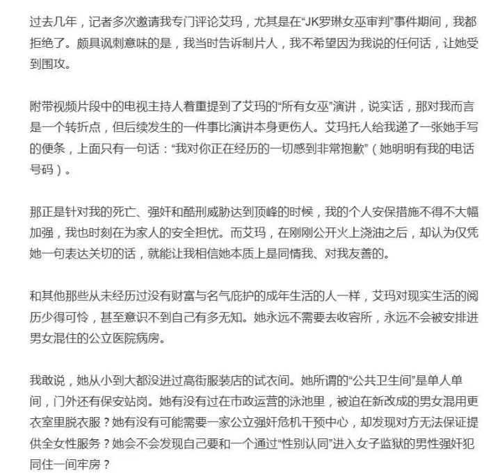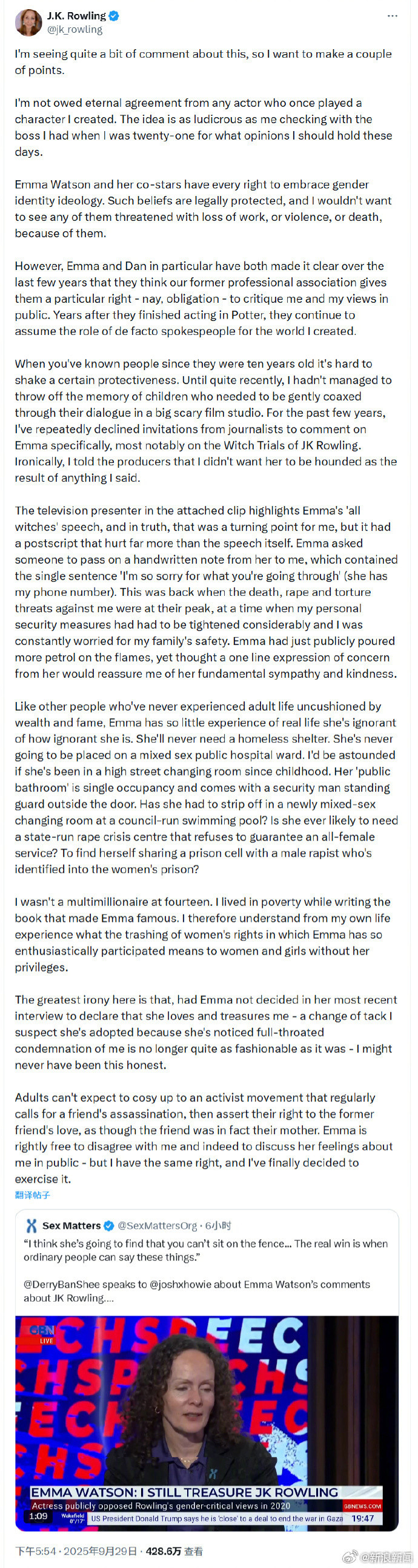 更让罗琳无法容忍的是艾玛的 “双面操作”。她揭露,当时自己因威胁升级被迫加强安保,家人安全时刻悬心,艾玛却在公开 “浇汽油” 后,托人转交了一张手写纸条,只轻飘飘写着 “对你经历的一切感到抱歉”。“她明明有我的电话,却从不直接联系,真以为一句客套话能掩盖虚伪?” 罗琳的质问直击要害。
