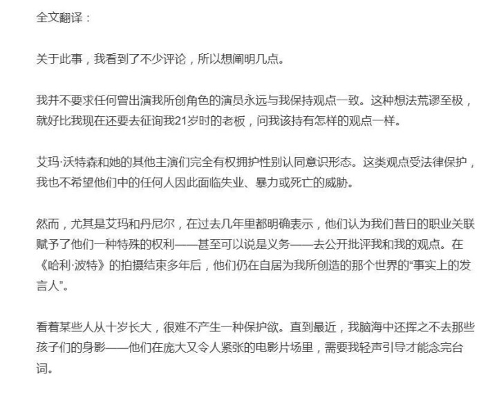 值得注意的是,罗琳并未否定艾玛的立场自由,而是直指其 “越界”:“她和丹尼尔(哈利扮演者)总觉得,演了我写的角色就有义务批判我,把自己当魔法世界代言人。” 她透露自己曾多次拒绝评论艾玛,怕对方遭围攻,如今的反击是 “终于决定行使自己的发声权”。而且这场决裂早已超越个人恩怨。当演员试图取代作者成为IP的精神领袖,罗琳的愤怒亦是创作者的抗争:“任何饰演过我角色的演员,无需对我永远认同——但谁赋予他们代表魔法世界审判我的权力?“