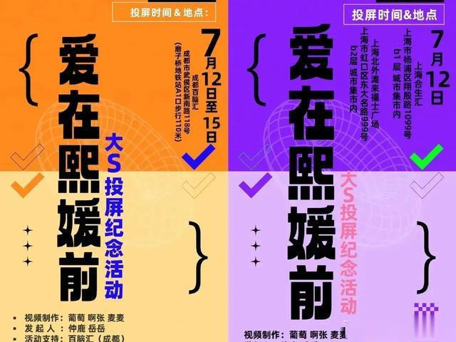 大S粉丝给她众筹“爱在熙媛前”纪念活动,在上海、成都两个城市的商场投屏同时播放。粉丝精心挑选出了大S的不同时期不同场合的照片,一笑一回眸,真的美到窒息!网友:粉丝用这样的仪式来纪念大S,小S却连一个告别会都没有给姐姐举办,还是粉丝更贴心……