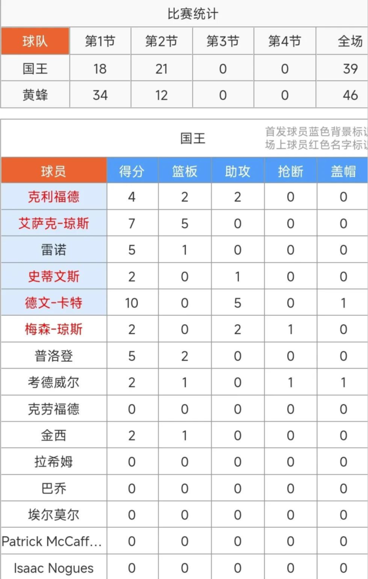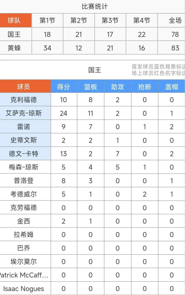 第一节开战,克利福德中距离投中2分,卡尔克布伦纳内线勾手上篮还击2分,又是克利福德突破上篮得2分,辛普森回来外线百步穿杨远射3分命中,开局黄蜂队5:4暂时领先!卡尔克布伦纳滑翔劈扣再来2分,雷诺同样双手灌篮暴扣还击2分,辛普森抛射打进2分。双方你追我赶杀的风生水起,首节结束黄蜂队34:18领先国王队16分。