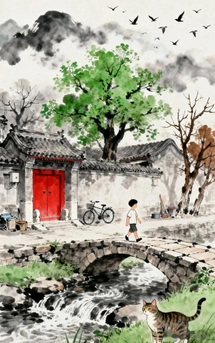 孩子的笑声,是这幅水墨画里最活泼的亮色。他们跑过深巷,跑过石桥,跑进了我们再也回不去的童年。