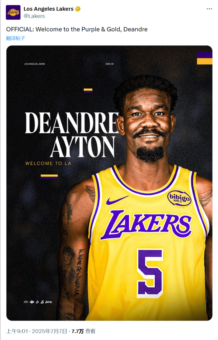 北京时间7月7日,NBA进入休赛期。湖人队官方宣布,球队正式签下中锋艾顿。球队总经理佩林卡和主帅雷迪克对他送上了充分的肯定和赞美。