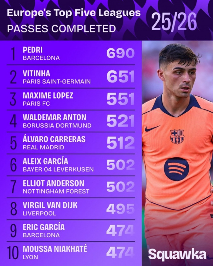 直播吧10月17日讯Squawka统计了本赛季到目前为止欧洲五大联赛球员传球次数排行,巴萨中场佩德里完成690次传球位居榜首,巴黎中场维蒂尼亚651次排在第二位。